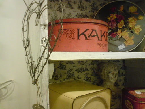 Ja..ja..ikke så nøye kanskje, men finfin butikk med både pynt og klær oog litt brukt, som disse trivelige nostalgiske kakeboksene...Begynte NESTE å fabulere om julebaksten..men FY::FY, det er ALTFOR tidlig!! Jula hører Desember til ble vi enige om i helga....